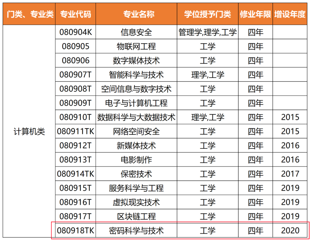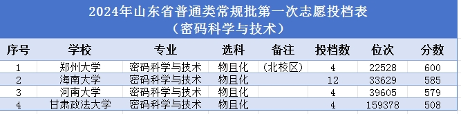 密码科学与技术专业是为适应国家网络空间安全战略而设的新兴本科专业,是国家特设控制布点专业,属于国家紧缺人才专业之一,2021年被列入普通高等学校本科专业目录。该专业以数学和计算机学科为基础,以密码理论和技术为核心,多种背景领域知识深度融合,是与国家网络空间安全战略、企业行业需求紧密结合的具有交叉特色的新工科本科专业。密码科学与技术专业属于工学门类、计算机类学科下的一个专业,修业年限为4年,毕业后可获得工学学士学位。截至2024年3月,我国开设“密码科学与技术”本科专业的高校增至20所,分别为南开大学、山东大学、华中科技大学、西安电子科技大学、北京电子科技学院、北京理工大学、海南大学、北京邮电大学、东南大学、暨南大学、湖北大学、华南师范大学、西安邮电大学、武汉大学、郑州大学、宁波工程学院、河南大学、广东技术师范大学、桂林电子科技大学、甘肃政法大学。2024年在山东进行密码科学与技术专业招生的高校录取情况如下: